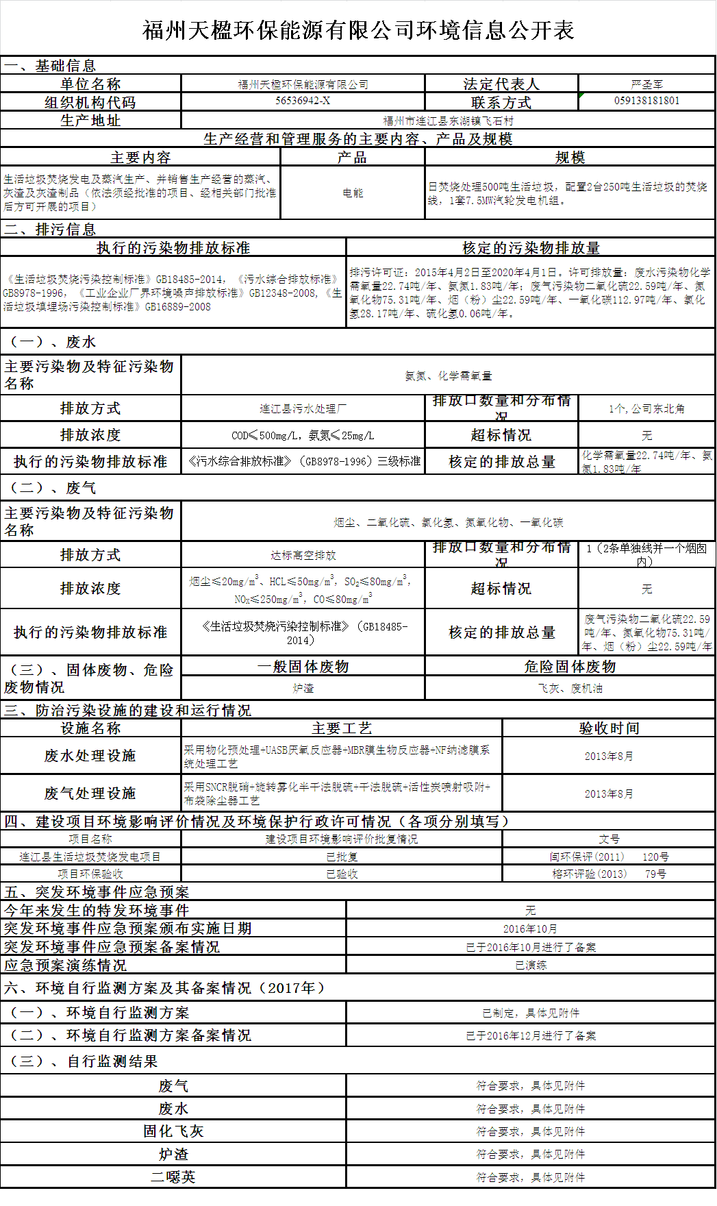 福州天楹環(huán)保能源有限公司2017年環(huán)境信息公開表