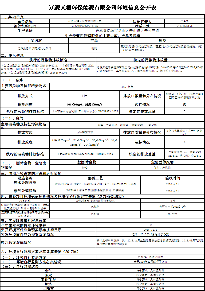 遼源天楹環(huán)保能源有限公司2017年環(huán)境信息公開表