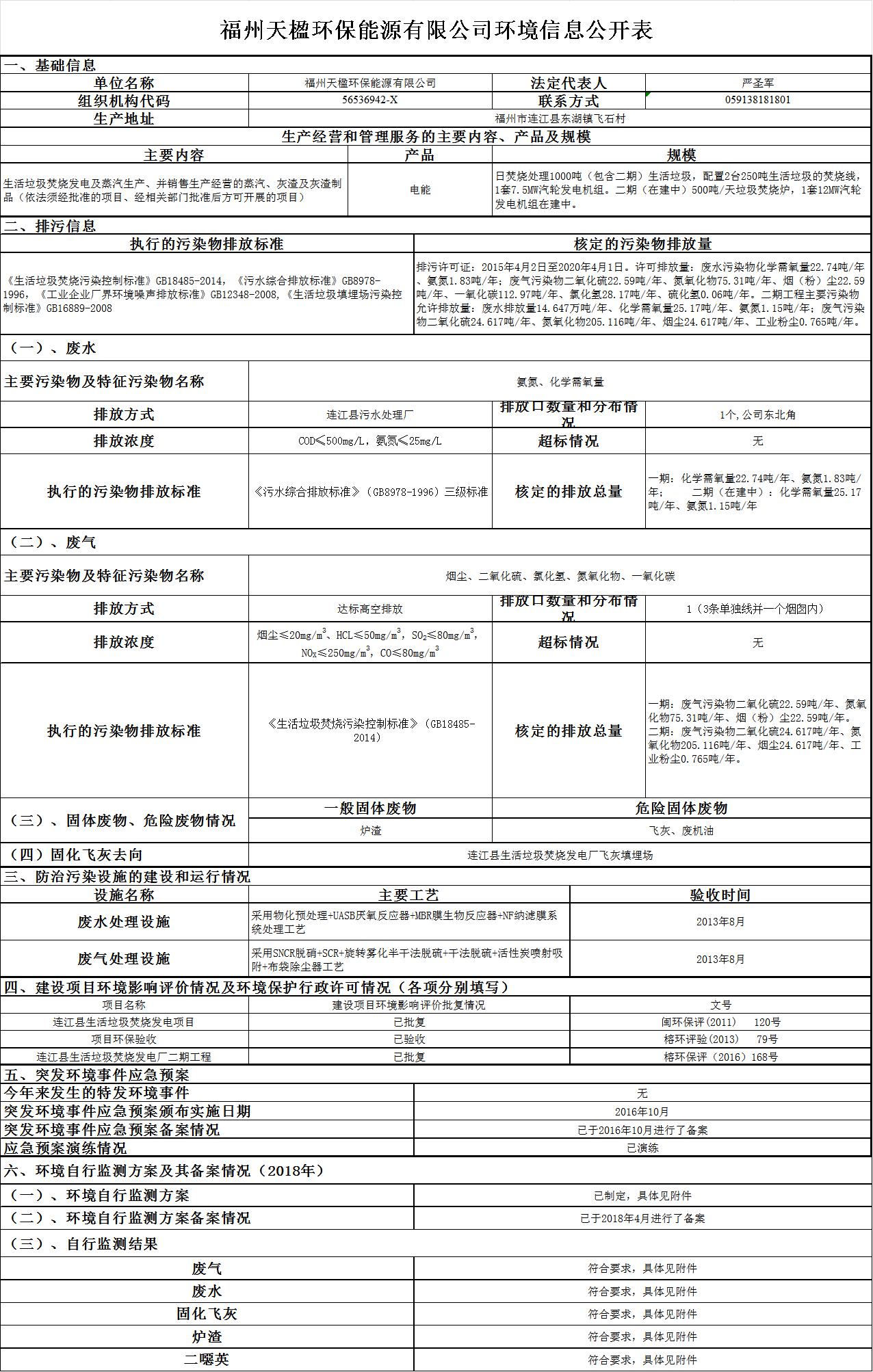 福州天楹環(huán)保能源有限公司2018年環(huán)境信息公開(kāi)表